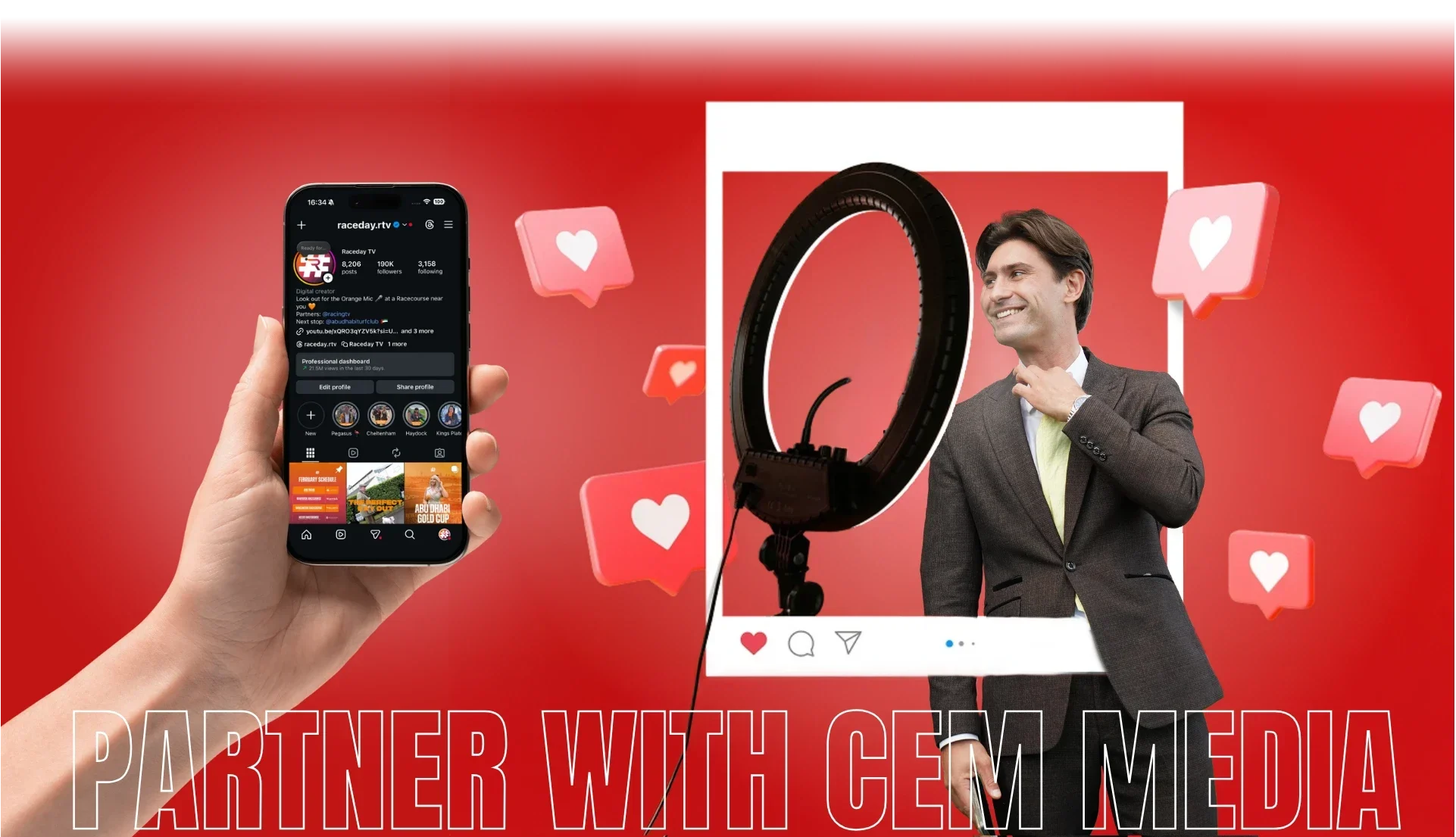 Working with CEM has been transformational for #Raceday. Their team has done a tremendous job driving phenomenal growth over the last few years, helping establish #Raceday as the biggest social media channel within horse racing. Through their strategic approach and creative execution, we have successfully reached new, younger audiences for the sport and significantly increased consideration for horse racing. As a result, our shareholder racecourses are now reporting strong uplifts in ticket sales among younger fans - a direct reflection of the engagement and excitement CEM have generated. The iconic orange mic has become synonymous with fan engagement at racecourses across the country and abroad, a testament to the cultural impact of their content. The team at CEM meticulously plan every event day, curate and post content with precision, and then we let the algorithms do the rest. Their expertise, reliability and commitment have been instrumental in the success of #Raceday.